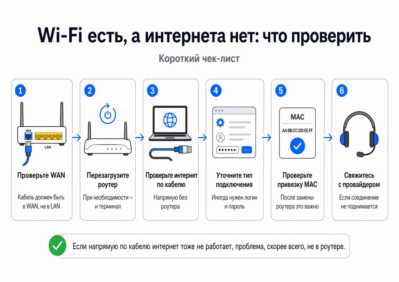 Если Wi-Fi появился, а интернета нет, сначала проверяют WAN, перезагрузку, кабель напрямую и тип подключения у провайдера